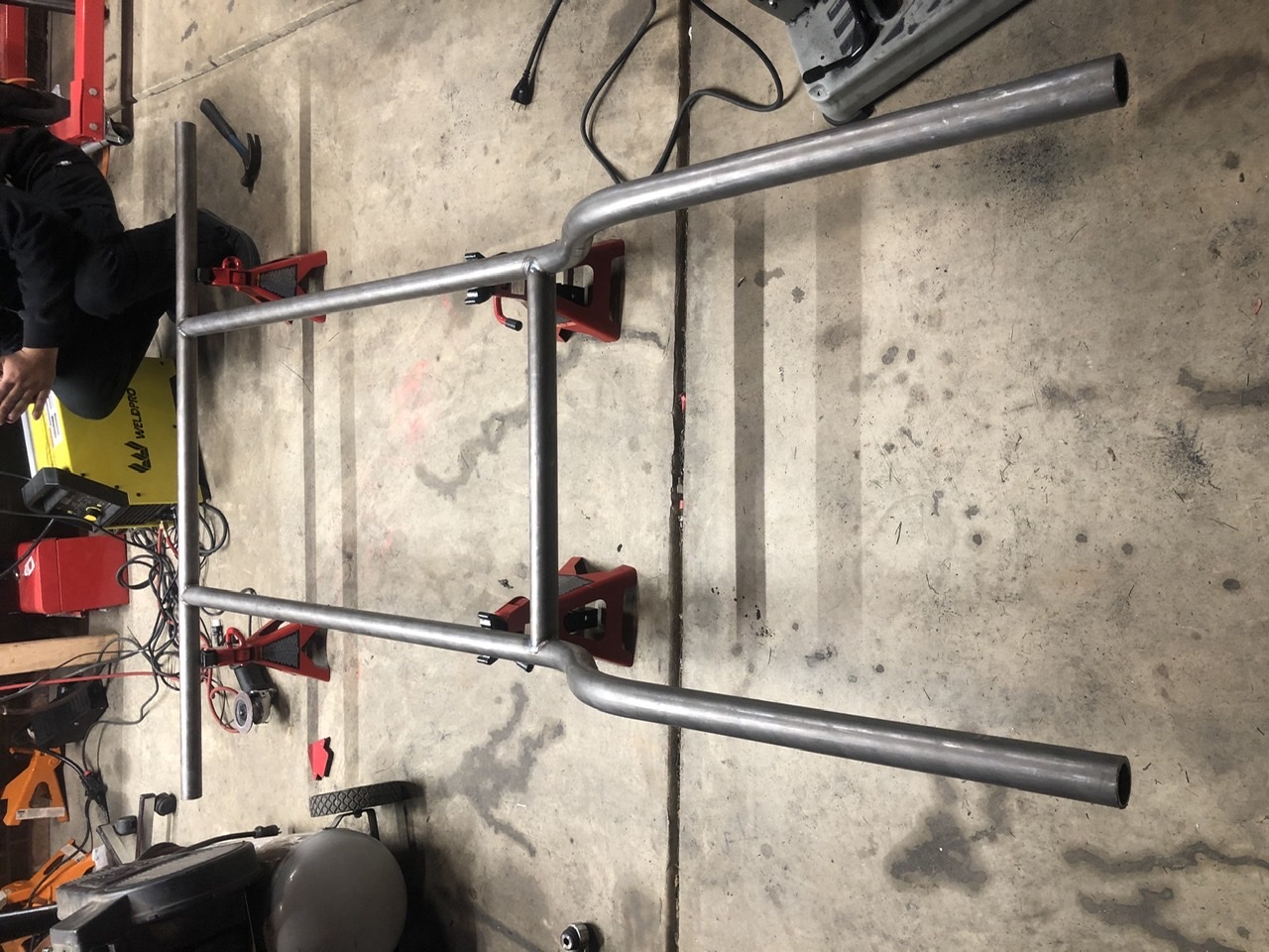 Looks great so far. Have you measured the floor jacks to ensure same height or not grossly off? Yep i welded them in place to ensure the same height and to dissuade me from using them on something else. Also made them level because without much weight on them they dont sit flat. |