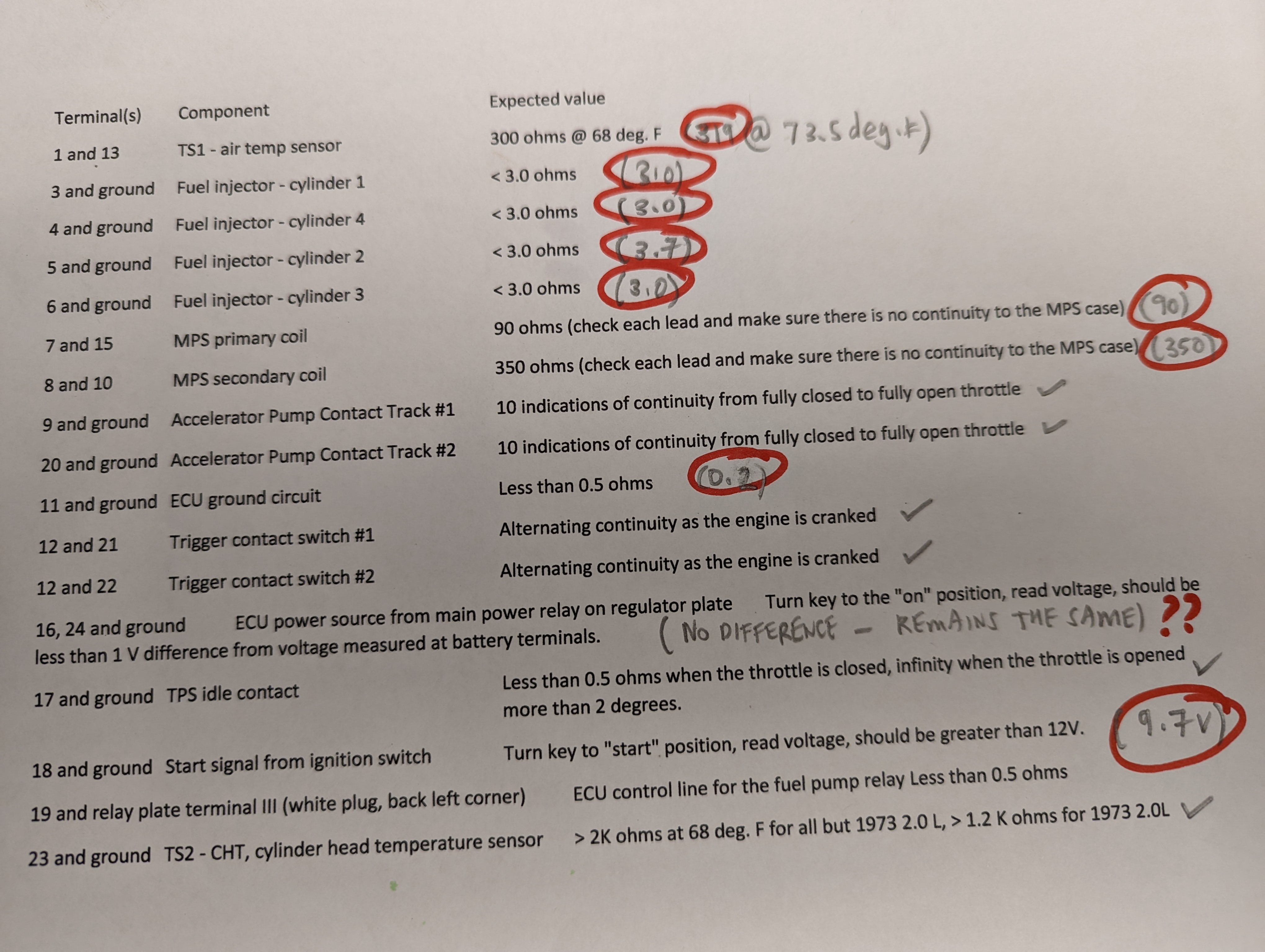 Porsche 914 2.0L 1974 (I believe was originally a 1.7L) My car starts, runs and drives but idles rough and wont rev past 4,000rpm. It hesitates on acceleration. I have changed virtually all components / parts from rebuilt MPS, tested TPS and works, ignition switch, fuel pump, air & cylinder head temp sensor, swapped out ECU to one that was tested to work, and the list goes on. I am posting my continuity test results with the hope that some may have experienced or had the same results and knows what to look into more deeply or can diagnose. The test results concluded the following: 1. When testing the ECU power source from main power relay I could not get the 1V voltage difference from the voltage measured at the battery terminal. No difference and remained the same. Voltage at the battery was 12.79 throughout 2. when testing the voltage at start signal from ignition switch the voltage dropped to 9.7V and was not greater than 12V. However, should be greater than 12V. So, can anyone help, please. I haven't been able to get the car run and drive right since being restored and have run out of options. Regards Michael Attached thumbnail(s) |