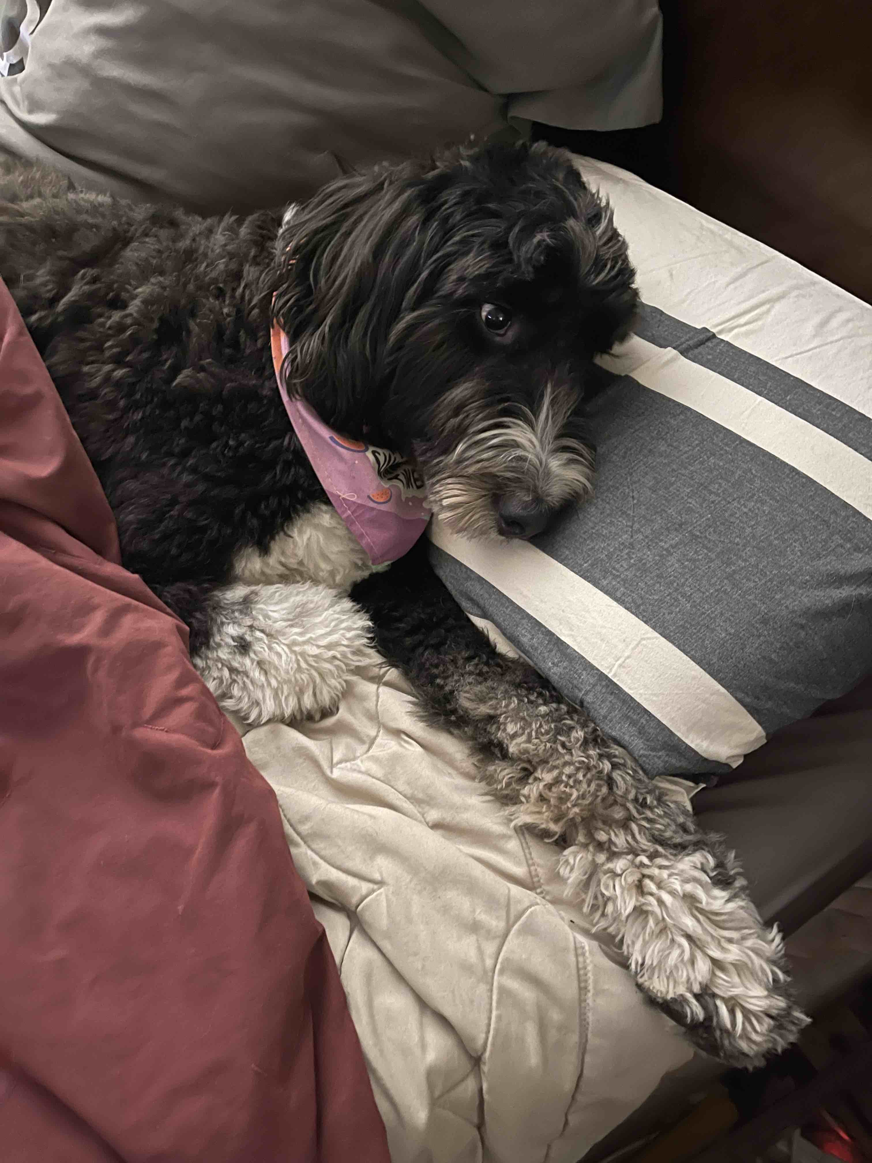 look around for them Would be highly unusual for a dog to chew and swallow oddly shaped metal object like a cam bearing. If they truly were swallowed I’d be concerned for the pooches health unless it’s the size if an Irish Wolfhound and can pass something like that. This is Monty. He is a 100lbs and a strong chewer. I took this picture after returning from the vet getting x-rays. Stomach and digestive system are clear. He knows he did something. Lessons learned to keep my work in the garage. I just got the crankshaft, crank and cam bearings and put them inside near the front door. Took the case in the garage, came back and realize the cam bearings were gone. We are now going through the entire house and yard. DaveB |