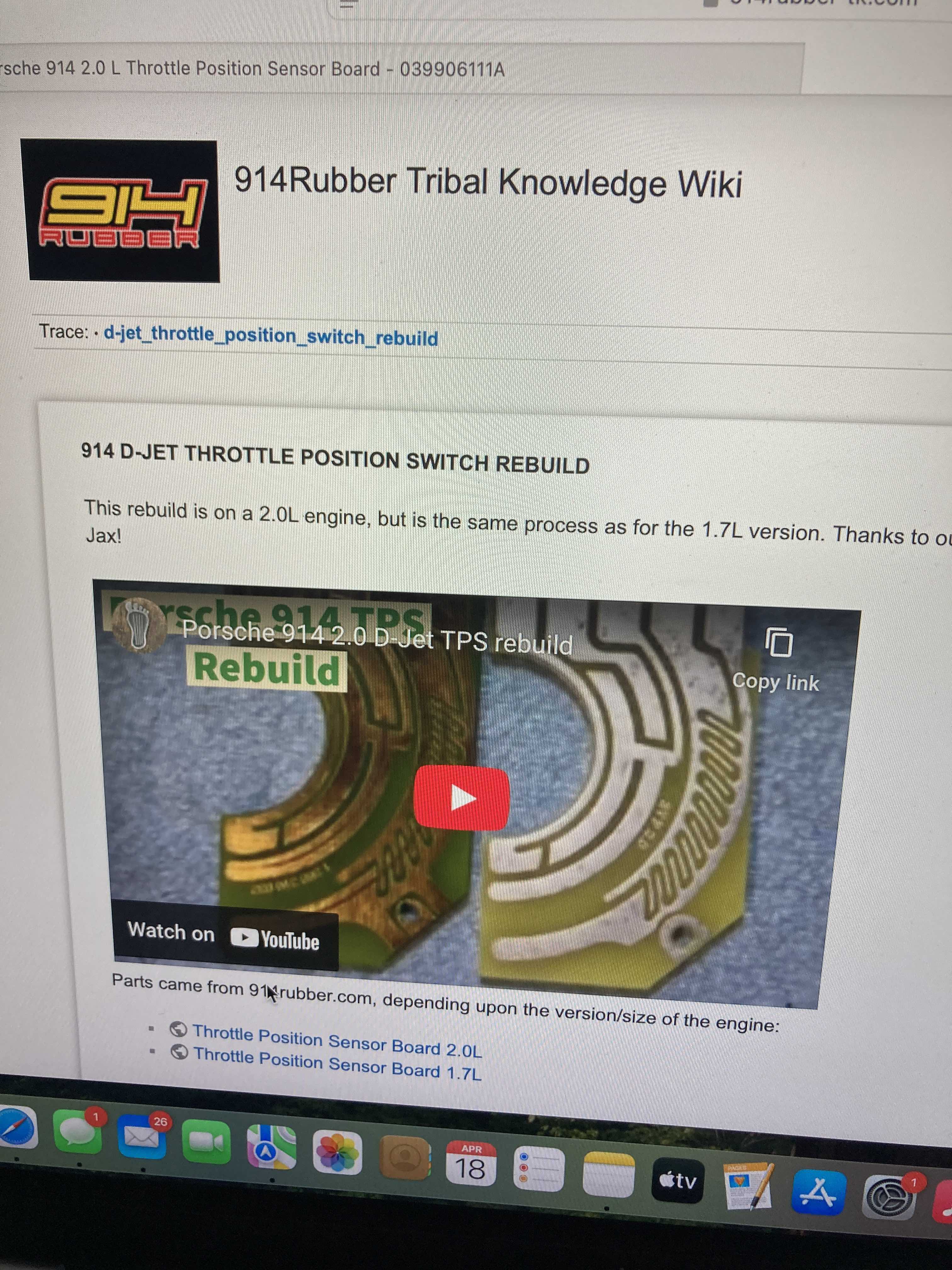 Im no guru, but the air screw is doing what its supposed to. 1/4 turn on it (90 degrees?) is actually quite a bit and sounds excessive. 1. Try turning the air screw much less, say 20 degrees at time to reduce the idle rpm, but not shut the engine down. 2. Idle mixture is set by the ECU knob which adjusts the ECU. For that knob to function, two contacts in the TPS need to be in contact to signal the ECU to take control of idle functions. All to say, confirm that your TPS is functional for all 4 circuits and that the TPS is calibrated correctly which will signal the ECU to control idle. 3. Check for other free air leakage locations, this can get tough - be thorough until you find a leak if it exists. AAR closed when warm? Injector gaskets well seated and not causing an air leak? Use a smoke pencil on the intake plumbing to check for free air making its way around gaskets, the TB pivot bushings, the air plenum etc. Hopefully this solves it. I've already done the leak checking with a smoke machine (mentioned in the un-DAPO thread). So, it's confirmed there are no undesired leaks in the intake system. Also made sure the AAR closes properly when warm. I've been trying to adjust the idle air screw in small increments. Unfortunately, I can make multiple small adjustments (5-10 degrees) with no change in the idle, and then one more little tweak will cause the engine to start it's downward spiral. Once that starts, I need to back the idle screw out like 1/2 turn or more to get it back to 1600 RPM. It's quite possible the TPS is not adjusted properly. It's one of the few things I haven't adjusted from the previous owner. My plan, when I replace the TPS board, is to just remove the whole throttle body from the car and adjust it on the bench before reinstalling. Anyone got a link to the TPS adjustment procedure? Hi Bill , It's on the 914 Rubber TPS purchase page. Its in the installation section for the TPS |