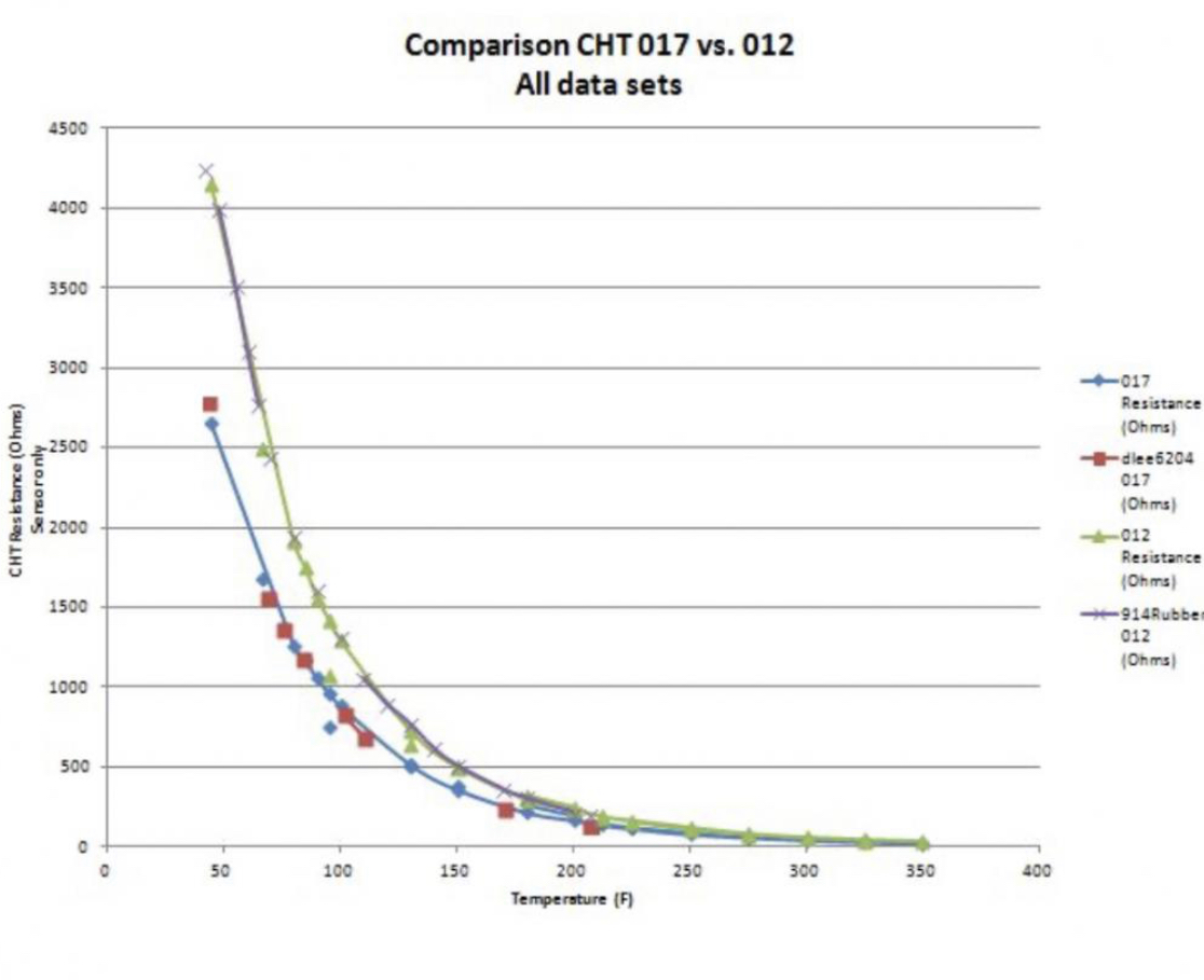 Known issues: it has the wrong CHT sensor (it's the one that's commonly available) and I think the TPS board has worn traces. I finally found the right CHT and ballast resistor, and I also have a 914Rubber replacement TPS board, and I will install both of them when I get a chance. However, I don't think either of those should keep it from idling at a reasonable RPM. Incorrect The 012 CHT forces an overly rich condition until the engine is hot which is totally consistent with you having to give it enough air to keep running. Then once it’s hot (200F) it’s forcing a lean condition if you don’t have the 270 ohm ballast resistor in place. Get the correct CHT and ballast resistor in it then reevaluate All data below is the CHT sensor only (no ballast resistance included) |